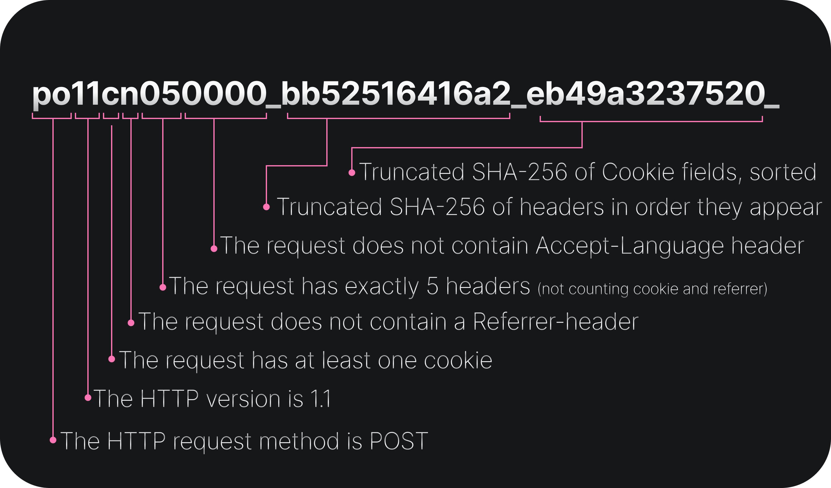 This dissection demonstrates that just by reading the fingerprint and knowing how it is generated, we can learn a lot about the underlying request and begin to experiment with custom detections. For example, we could look for similar requests with a different number of headers (po11cn*0000_*_eb49a3237520_*), or we could look for similar requests without any cookies set (po11nn050000_bb52516416a2_*).