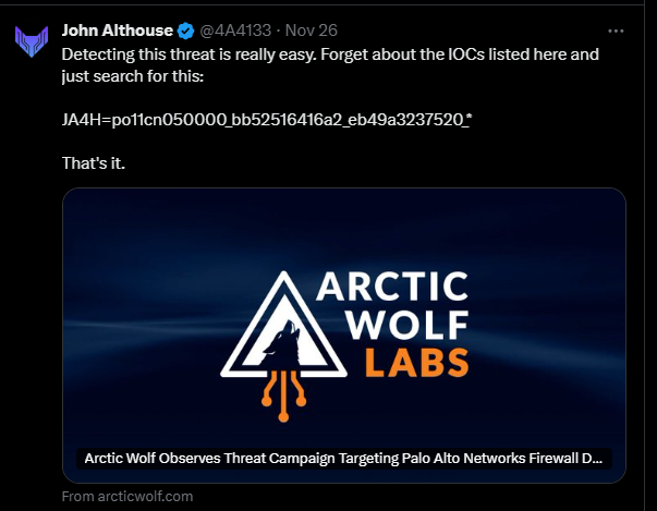 Shortly after the watchTowr report became public, Arctic Wolf Labs detected a series of intrusions targeting Palo Alto Networks devices. Their findings were reported on November 22 in a blogpost titled “Arctic Wolf Observes Threat Campaign Targeting Palo Alto Networks Firewall Devices”.